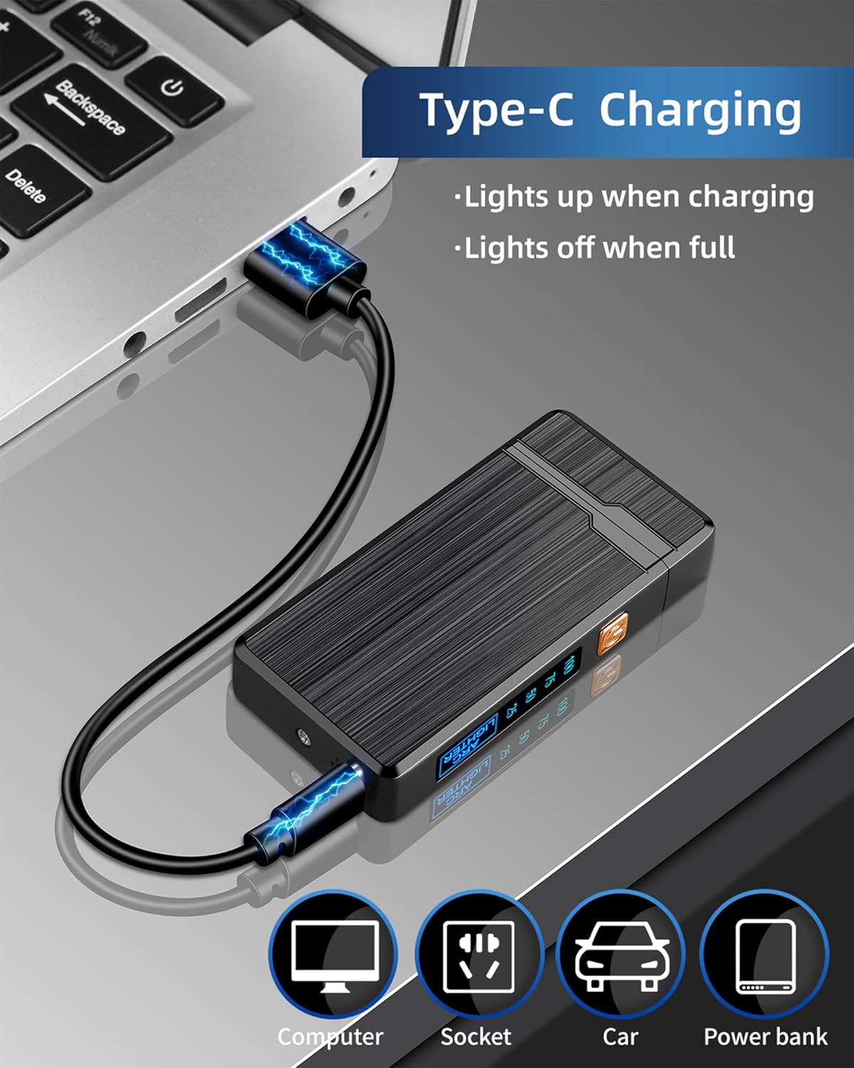 WIND & SPLASH PROOF: The electric windproof lighter is butane free and no harmful chemical.The flameless lighter can ignite things under bad weather.