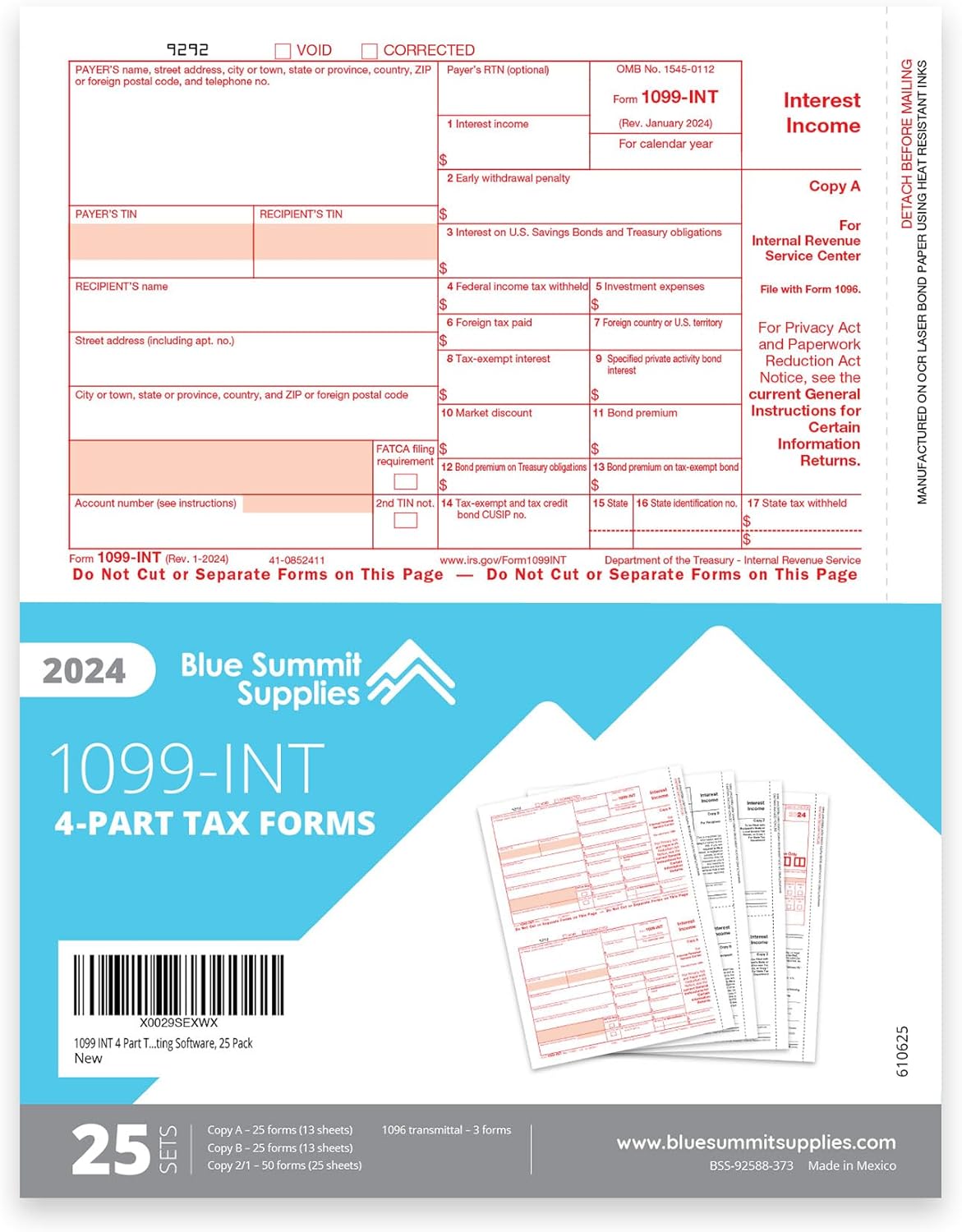 25 Pack Set of 1099-INT Forms for Reporting Interest