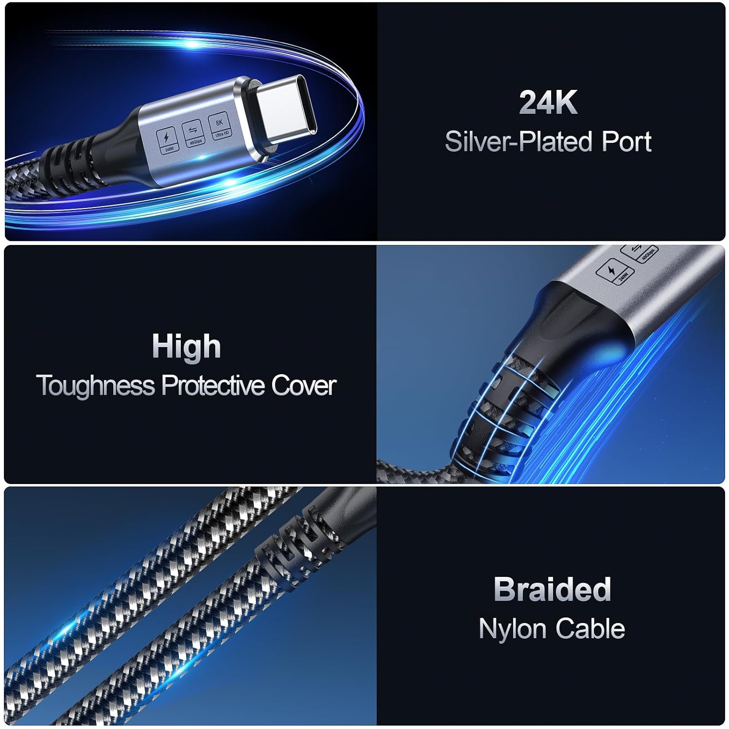 The USBC to USBC Thunderbolt 4 Cable with the latest upgraded chip certification, it can be paired with high-power chargers such as 30W/45W/60W, and supports up to 240W (48V/5A) high-speed charging output, providing fast charging for any USB-C device such as your phone or laptop. Supports the USB4.0 standard, providing unparalleled data transfer speed of up to 40Gbps bandwidth for compatible USB4 devices.