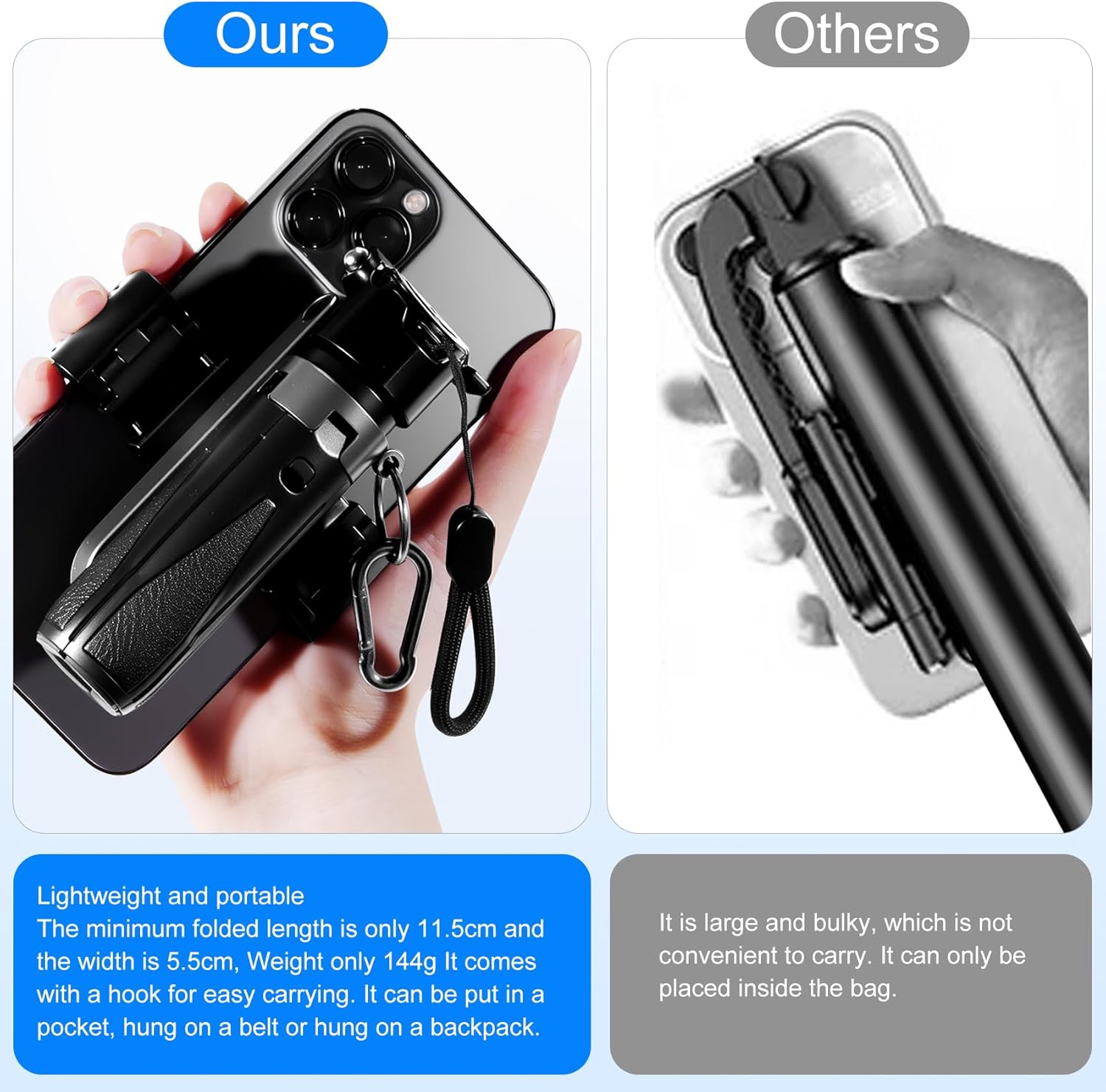 Portable design: Phone tripod stand small and light, foldable and storable, the size of a keychain, can be easily attached to a pants or bag, and can be carried around without taking up space.