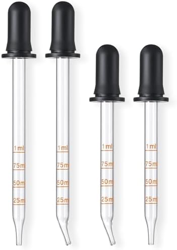 Product Include – 4 pack high quality glass droppers (1ml capacity). 1 long & straight end; 1 long & curved end; 1 short & straight end; 1 short & curved end.
