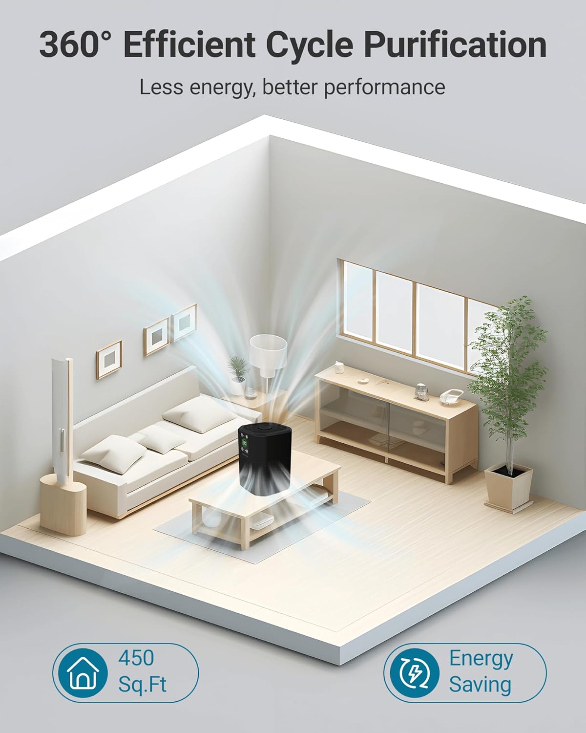 Highly Efficient Purification & Easy Operation: The desk air purifier is designed with 360° suction holes, and the H13 true HEPA 3-in-1 filter on the inside, which can strongly filter the dust in the air and output fresh and healthy air, cover of 450 sq.ft. The LED touch screen buttons are very easy to operate, gently touch the screen to switch the purification modes. 4 air speed purification modes, just according to your needs to set one of the purification modes