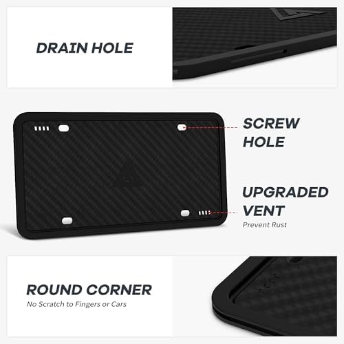 ????HIGH-QUALITY SILICONE MATERIAL: The universal carbon fiber license plate frame is made of industrial-grade silicone which is characterized as rustproof, rattle proof and weatherproof, preventing your car from scratches, rust, deformation and fading in comparison to most metal license plate frames.