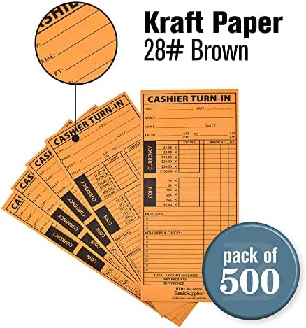 Bank Supplies Cashier Turn in Envelope | 500 Envelopes | 4-4/2W x 10-3/8H | Standard Open End | Cashier Report Envelope | Brown Kraft Paper | Moisten & Seal Closure