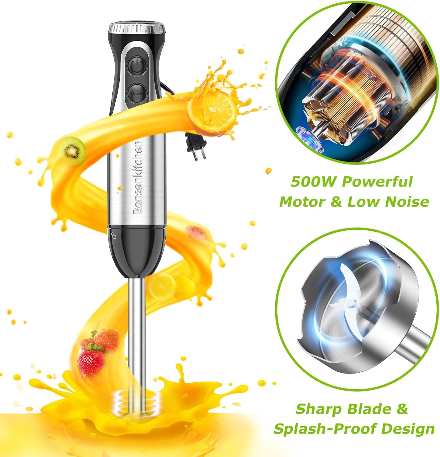 Power & Fast: Equipped with an enhanced 500 Watt high-torque power motor + turbo blending, this immersion blender handheld with food processor can handle more blending tasks and easily make smoothies, milk shakes, soups, puree or baby food
