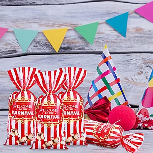 Carnival Candy Bags Circus Plastic Bags Carnival Party Treat Bags Popcorn Pattern Party Bags Goody Bags with 100 Gold Twisted Ties for Party Favor Supply Cookie Cupcake Wrapping(Simple,100 Packs)
