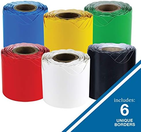 WHAT’S INCLUDED: This set features 6 multicolor scalloped border rolls to create a bright, colorful classroom or homeschool display. The set includes primary colors such as red, green, blue, yellow, black, and white.