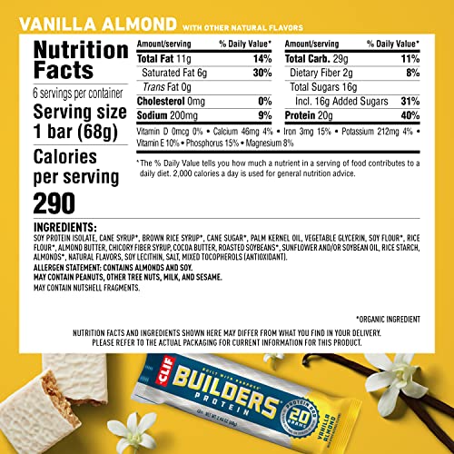CLIF BUILDERS – Protein Bars – Vanilla Almond Flavor – 20g Protein – Gluten Free (2.4 Ounce, 12 Count)
