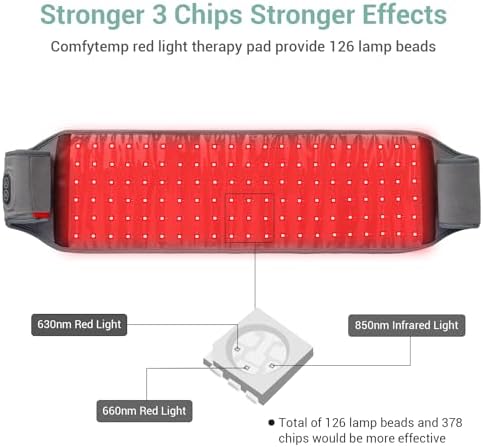 [3 Professional Grade Infrared Red Light Therapy] Comfytemp’s vision is to help customers get out of expensive spa and into the comfort, convenience and effectiveness of red light therapy for body at home. Our red infrared light therapy belt has a total of 126 pcs professional lamp beads with new 3 chips technology, each lamp contains 3 chips which is 630nm and 660nm red light, 850nm infrared light, which can speed up wound healing, relieve pain, reduce inflammation and recovery body energy.