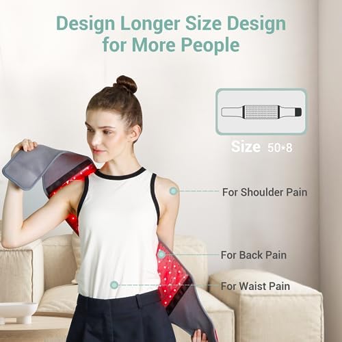 [Lightweight & Compact] Our infrared red light therapy belt for body at 50″ x 8″ size, the red light coverage area is 22″ x 8″, can perfectly meet your needs and suitable for multi-purpose use, such as shoulder stiffness, waist back pain, muscle pain, joint inflammation, leg and knee sports injury, menstrual pain, tummy leg fat reduction with hands-free, come with 5.9ft wall outlet cable to support you sitting or lying on the sofa, device come with 20 minutes timer off, convenient for your use.