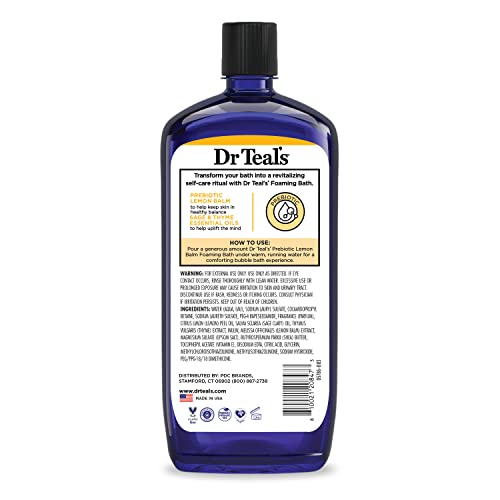 Dr Teal’s Prebiotic Lemon Balm Foaming Bath transforms your bath into a relaxing self-care ritual with long-lasting bubbles that gently cleanse, condition, and moisturize. A warm bath in combination with Pure Epsom Salt (Magnesium Sulfate USP) and essential oils provides warmth and relaxation when you need it most. Prebiotic Lemon Balm helps keep your skin in healthy balance, while a blend of Lemon, Sage, and Thyme essential oils helps relax the mind and uplift the mood. Paraben free, phthalate free, and never tested on animals, we craft our products to decrease your stress and promote all forms of wellness. Pour a generous amount of Dr Teal’s Prebiotic Lemon Balm Foaming Bath under warm, running water for long-lasting bubbles, and pair with Dr Teal’s Prebiotic Lemon Balm Salt Soaking Solution for an elevated self-care ritual.