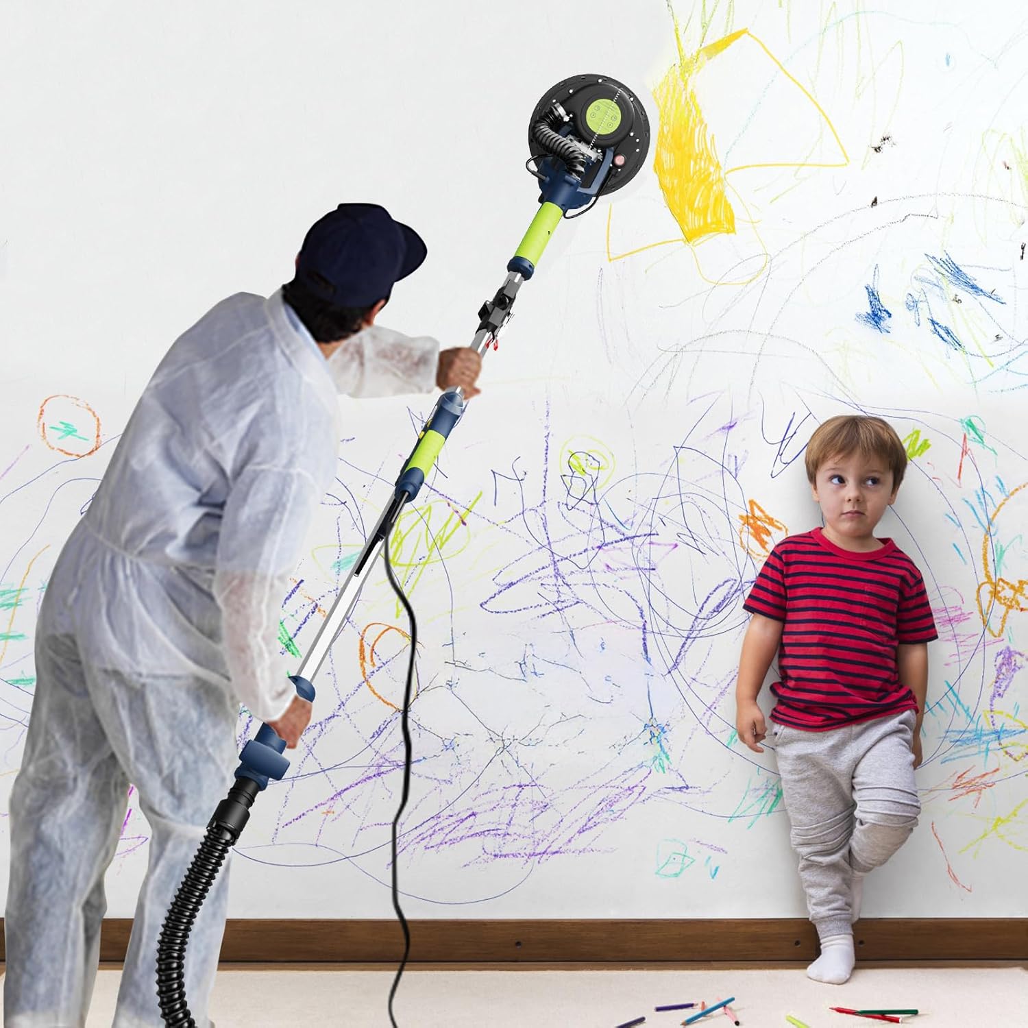 Folding handle and included extension pole: The collapsible handle design makes the wall sand more portable and easier to carry and store. You can easily open the handle when needed and fold it up when not in use to reduce its size. This design helps you manage your tools and equipment more efficiently. In addition, this sander comes with an extension rod that can extend the length of the machine from 3.9 feet to 5.5 feet. The handle can be adjusted in length as needed to accommodate different working heights, increasing flexibility and versatility.