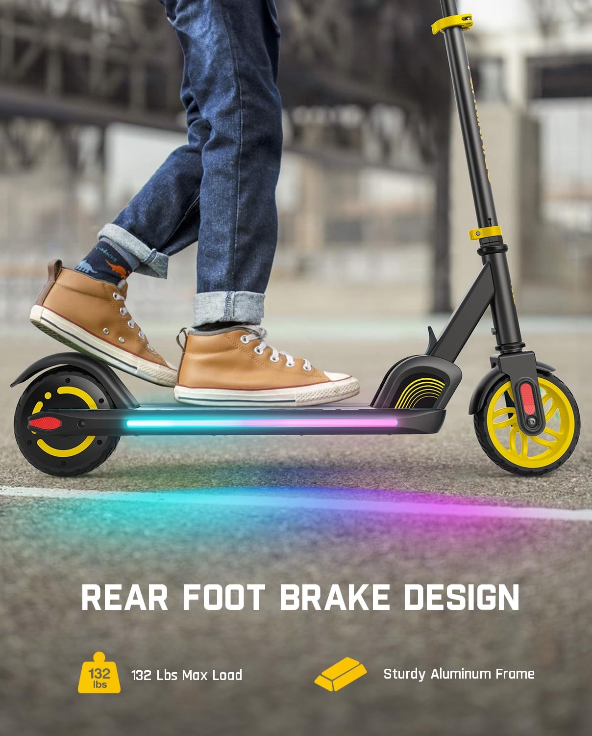 Bluetooth Music Speaker & 6 Lights Modes: The kids’ electric scooter has a Bluetooth music speaker that plays music while riding. It features rainbow lights with 6 modes that sync to the music, attracting attention and improving safety during night rides