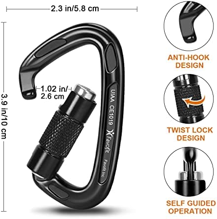 Favofit UIAA Certified Climbing Carabiners, 3 Pack, 25KN (5620 lbs) Heavy Duty Large Locking Carabiner Clips for Rock/Ice Climbing Rappelling Rescue Swing etc, Black