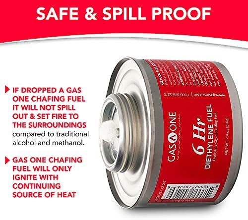HIGH QUALITY BURN – Filled to the brink with liquid fuel and sealed with a high-quality wick, Gas One’s Diethylene Chafing fuel burns up to 6 hours, maintaining a clean, steady flame