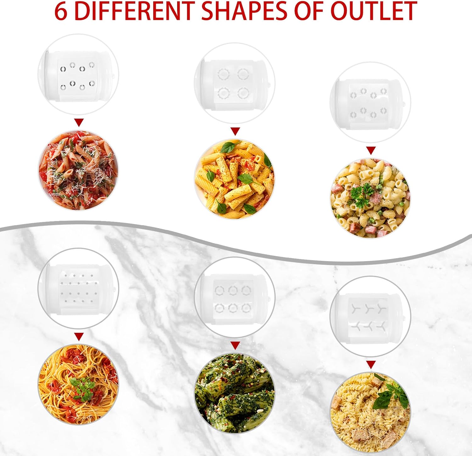 6 Different Pasta Shapes, effortlessly create six pasta varieties: Spaghetti, Bucatini, Fusilli, Rigatoni, Small Macaroni, and Large Macaroni.