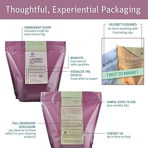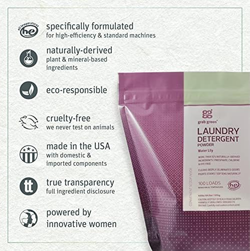 Save time & money with Grab Green concentrated 3 in 1Laundry Detergent Powder: superior detergent, remarkable stain remover & beautiful brightener, all in a concentrated powder. Thoughtful packaging includes a convenient, easy to use Velcro closure, clear use instructions, a measuring scoop for easy & efficient measuring, and we believe in full ingredient disclosure—what we call True Transparency—which is why we list every ingredient and the purpose for each ingredient on every package. Formulated for standard & high-efficiency machines, our sweet & citrusy Water Lily fragrance is made with essential oils lavender, lavandin, lime and orange. We responsibly source quality plant & mineral-based ingredients and work directly with our team of organic chemists to create effective, naturally-derived, non-toxic cleaning products.