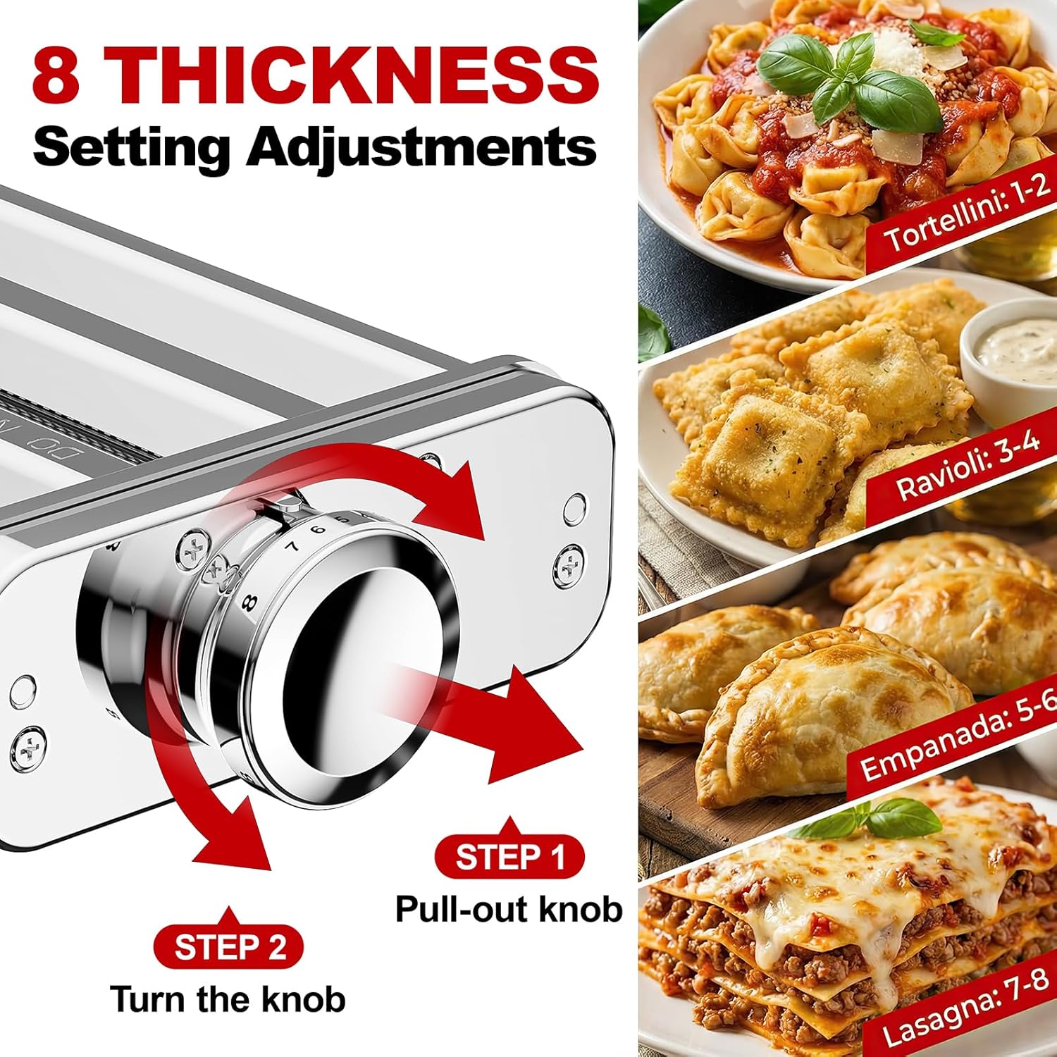 STAINLESS STEEL 3-IN-1 PASTA MACHINE: Separate type pasta maker with a premium stainless steel attachment set. The pasta sheet roller has 8 adjustable thickness settings (0.4–2 mm / 0.016–0.08 in) for personalized pasta sheets, and built-in fettuccine & spaghetti cutters for endless versatile noodle options.