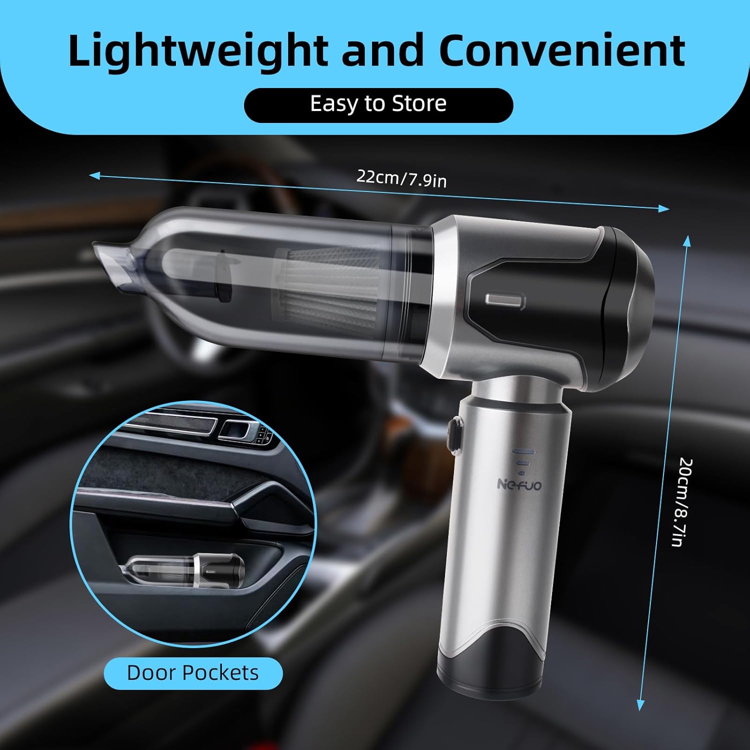 【9-in-1 Multifunctional Design】Switch between vacuum, blower, and 7 specialized nozzles (crevice, brush, flat, etc.). This hand vacuum cordless rechargeable tackles diverse messes in cars, homes, offices, and RVs with versatile ease
