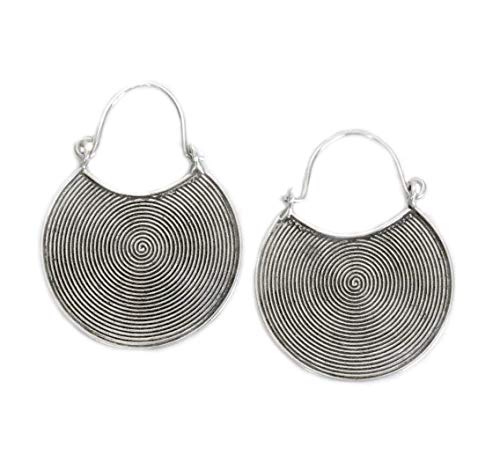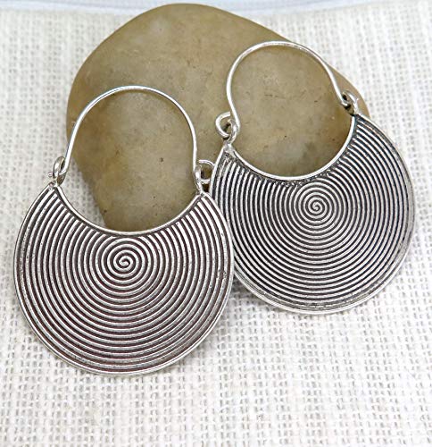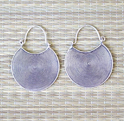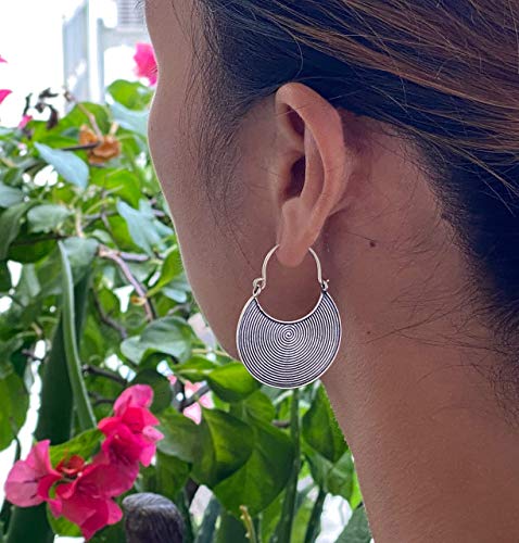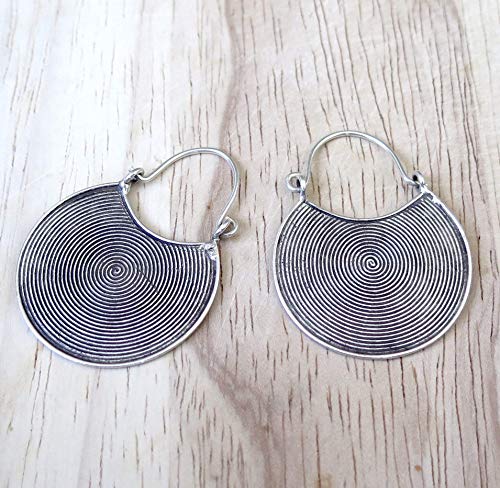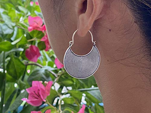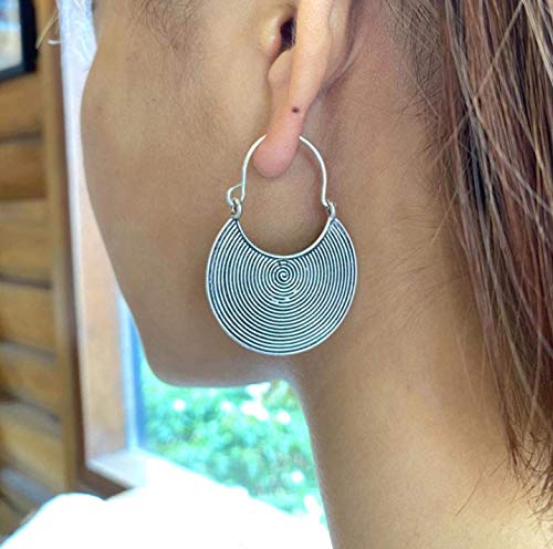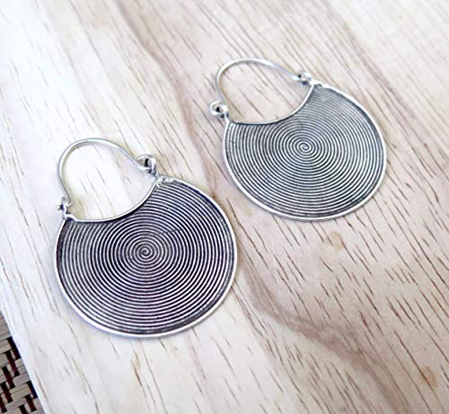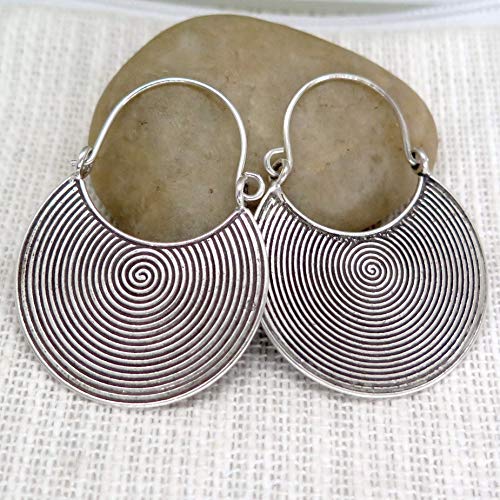 Handmade Sterling Silver Boho Ethnic Large Moon Hoop Earrings, 1 9/16 inches Oxidized Dark Spiral on Moon Shape Disc Tribal Gypsy Statement Earnings, Gift for Herment Earnings, Gift for Her