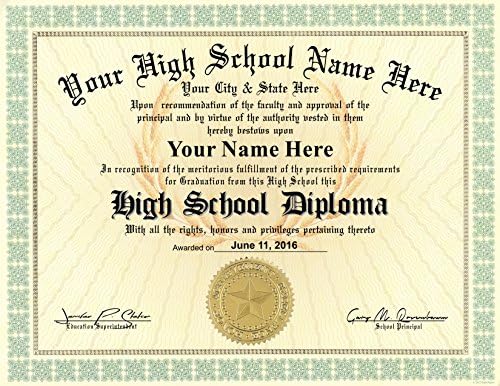 High School Diploma – Custom printed with your School Name, City / State, Graduates Name and Graduation Date. Principal and Superintendents name will be a generic name printed with a realistic signature font. Great for replacing your missing, torn, damaged or lost Diploma. This custom printed High School Diploma is printed on heavy weight, Green or Blue (Depending on our current Paper Stock. Measures 8.5 by 11 inches and is suitable for framing (frame not included). Certificate comes with a FREE CERTIFICATE Folder as shown in listing. Hurry, get yours today!!!