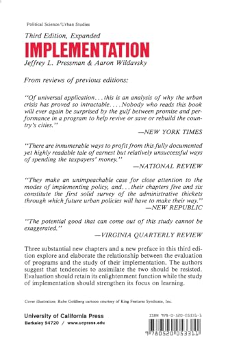 Three substantial new chapters and a new preface in this third edition explore and elaborate the relationship between the evaluation of programs and the study of their implementation. The authors suggest that tendencies to assimilate the two should be resisted. Evaluation should retain its enlightenment function while the study of implementation should strengthen its focus on learning.