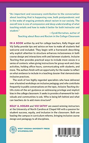 In a book written by and for college teachers, Kelly Hogan and Viji Sathy provide tips and advice on how to make all students feel welcome and included. They begin with a framework describing why explicit attention to structure enhances inclusiveness in both course design and interactions with and between students. Inclusive Teaching then provides practical ways to include more voices in a series of contexts: when giving instructions for group work and class activities, holding office hours, communicating with students, and more. The authors finish with an opportunity for the reader to reflect on what evidence to include in a teaching dossier that demonstrates inclusive practices.