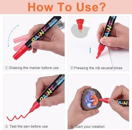 【Shake Well Before Every Use】Only 4 steps, you can draw after you receive the Oil-Based Painting Marker( Shake, Uncap, Press, and Draw). They go smooth, ink flows nicely, dry quickly and the color doesn’t bleed. They make a great coverage for tons of project.