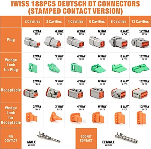 IWISS Deutsch DT Series Connector Assortment, Size 16 Stamped Contacts, Waterproof Automotive Electrical Connectors, 188 Pieces