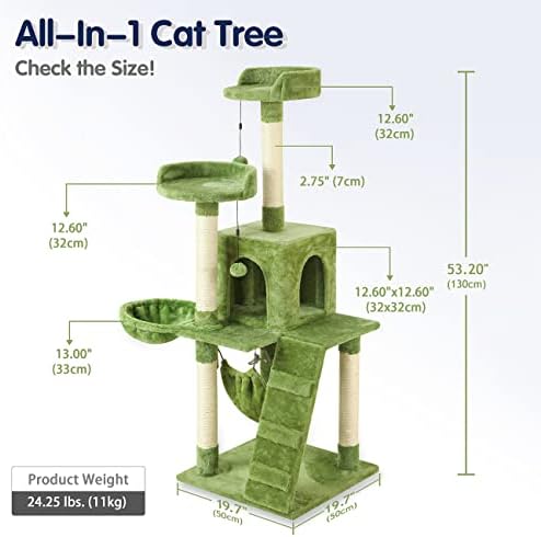 KZLAA 53in Cat Tree Tower Condo Furniture Scratch Post with Natural Sisal Rope , Multi-Level Cat Condo with Hammock & Cradle for Kittens, Tall Cat Climbing Stand with Plush Perch (Green)