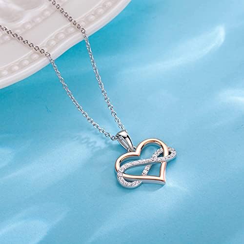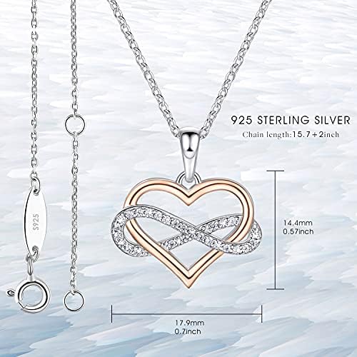 Materials of Infinity Rose Gold Necklace💕 Size: 0.70’’*0.57’’. Chain Length:15.7’’+2’’ adjustable. The heart pendant of the infinity heart necklaces for women is made of 18k rose gold plated, which is a very fashionable and beautiful pink rose color. The chain of this heart necklace is made of 925 sterling silver, which is not easily broken, discolored or tangled. The exquisite polishing technique makes every detail smooth and dazzling