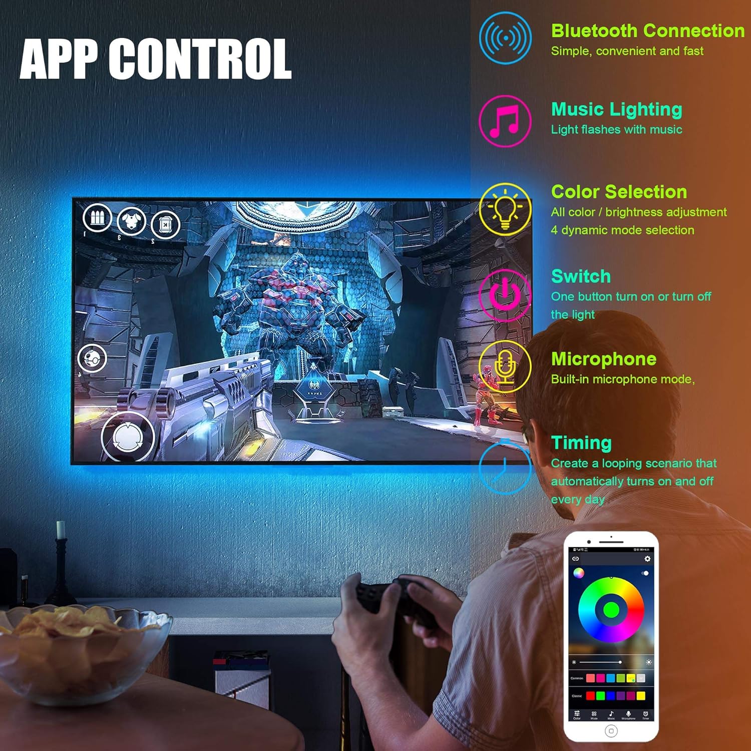 App Timing and Music Functions: Turning on the music mode or use built-in microphone, the light strips will sync to music show different colors, The led strip lights has color memory function, set the time, and let the strip lights automatically turn on and off are your favorite colors.