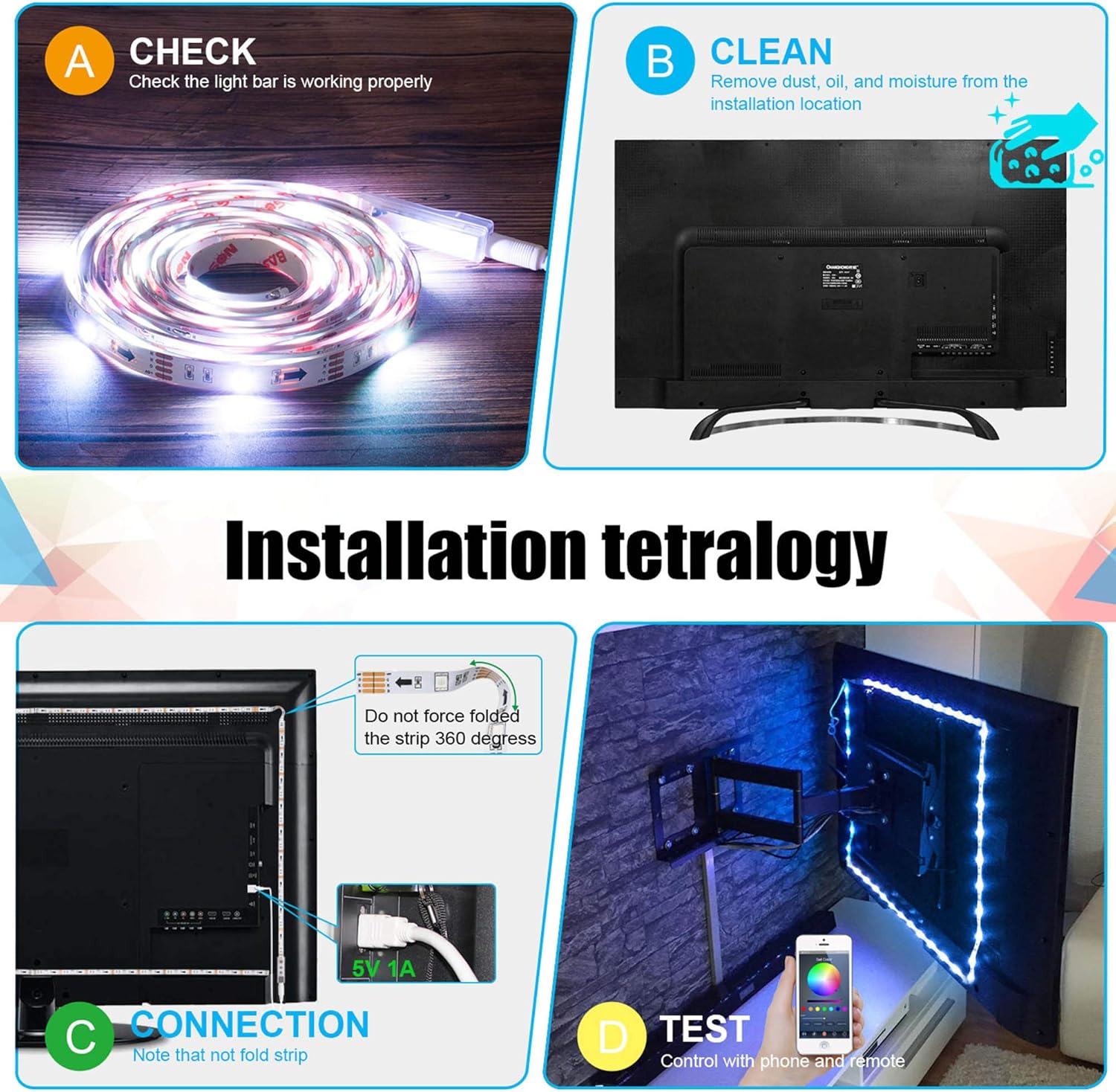 Adhesive installation: use double-sided tape and fixing buckles, TV corner can fold flexible led light strip.