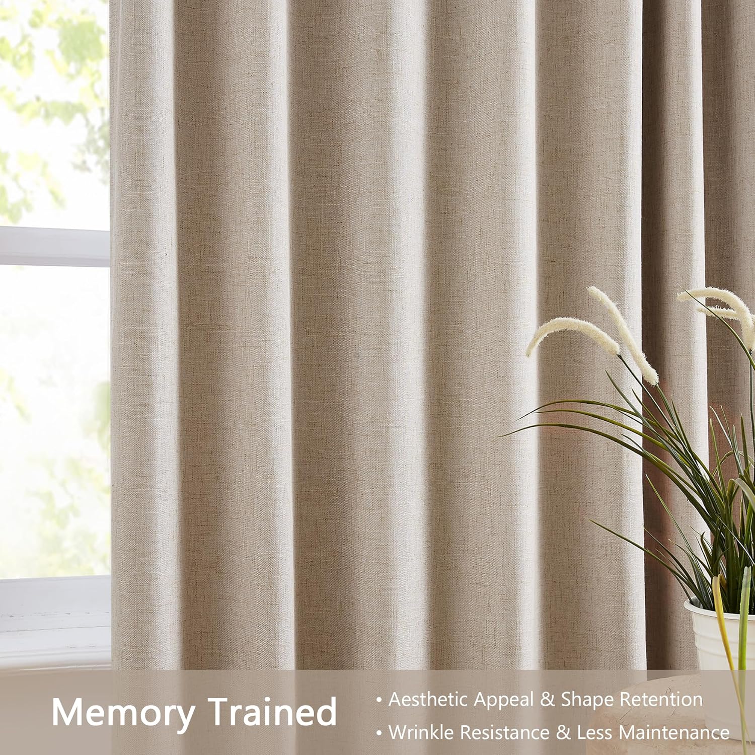 Flax Blend Blackout with White Liner: Our natural pinch pleated blackout curtains feature a sewn blackout coated lining, which effectively blocks out more than 95% of sunlight, UV rays, and external noise. This makes them perfect for those who work night shifts or are sensitive to light, ensuring a peaceful and restful environment.