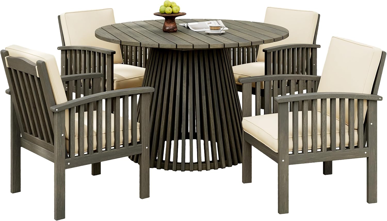 Durable All-Weather Construction:This outdoor set is built to withstand the elements. The four CLUB CHAIRS are crafted from solid Acacia wood with a sleek Grey Finish, paired with Cream cushions for comfort. The wood’s natural durability resists wear, while the water-resistant fabric cushions (spot clean only) protect against spills. The accompanying DINING TABLE, also in Grey Finish, features a circular Acacia wood top and a unique slatted base for both style and sturdiness.