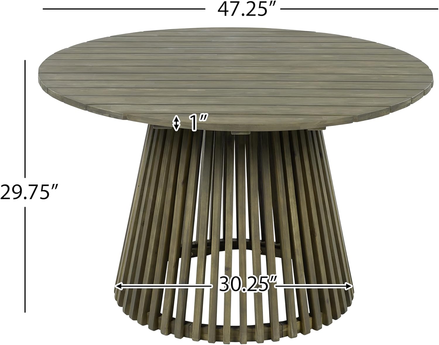 Stylish & Sturdy Dining Table:The DINING TABLE impresses with its 47.25-inch diameter circular top and 29.75-inch height, supported by a distinctive slatted base made of Acacia wood. This unique base not only elevates the table’s aesthetic but also ensures it can bear up to 300 lbs of weight. The Grey Finish complements the chairs seamlessly, while the solid wood construction guarantees reliability in any outdoor setting.