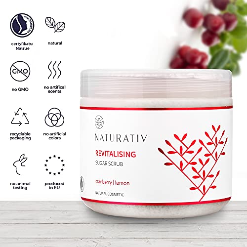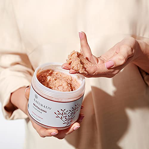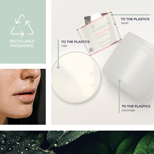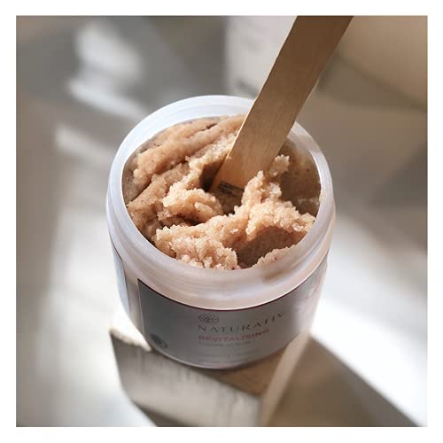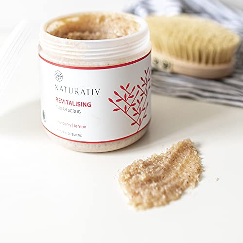 Fall in love with yourself! Naturativ’s Revitalizing Sugar Scrub with our Lemon Garden scent, gently buffs away all your dead cells, deeply cleansing, soothing, and moisturizing your skin.Superstar ingredients including cranberry and lemon, instantly detoxify the skin’s surface, repair skin damage, and calm your senses with their zesty and fresh scent.A rich blend of plant butter specifically picked for their regenerative and protective properties make you glow with a healthy radiance.Indulge in this luxury twice a week and leave out the moisturizer treatment after since we have you covered and have already included that in the Naturativ Revitalizing Sugar Scrub treatment.