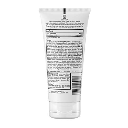 Help get clearer-looking skin with Neutrogena Rapid Clear Stubborn Acne Facial Cleanser. This daily acne-fighting face wash is clinically proven to rapidly reduce the size and redness of stubborn acne in just one day. The maximum strength formula contains 10 percent benzoyl peroxide, the acne medication dermatologists recommend most for clearer skin without a prescription. Benzoyl peroxide effectively treats and cleanses skin to fight acne and prevent future breakouts. With continued use, Neutrogena Rapid Clear Stubborn Acne Facial Cleanser works to reveal clearer, healthier looking skin. This acne treatment face wash is suitable for daily use as part of a regular acne skin care routine for both morning and nightly cleansing.