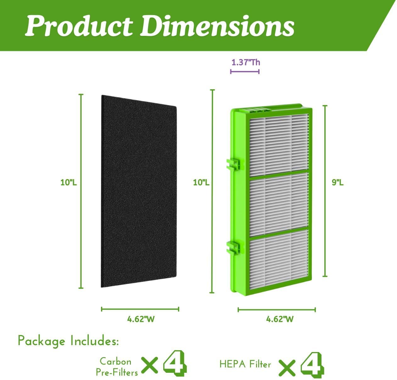 Includes 4 HEPA filters and 4 activated charcoal pre filters. SIZE: 1.2 x 10 x 4.6 inches. 100% customer satisfaction guaranteed. Quality meets or exceeds leading national brand.