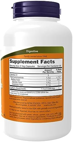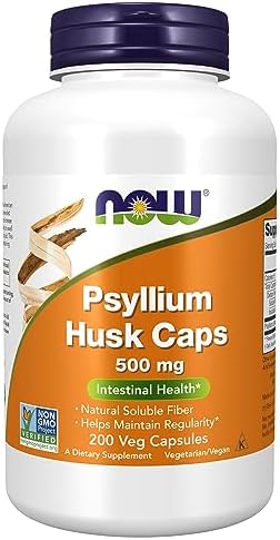 NOW Supplements, Psyllium Husk Caps 500 mg, Non-GMO Project Verified, Natural Soluble Fiber, Intestinal Health*, 200 Veg Capsules