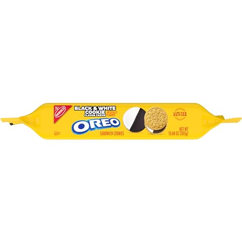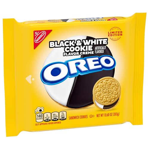 Enjoy two delicious cookies in one with OREO Black and White Cookie Creme Sandwich Cookies. These limited edition OREO cookies feature two Golden OREO vanilla wafers filled with side-by-side dark chocolate cake flavored creme and white cake flavored creme. They’re an OREO twist on traditional Black and White Cookies which are mini cakes and have two kinds of frosting. Twist ‘em, dunk ‘em, share ‘em, or enjoy them all on your own – they’re the perfect anytime snack cookies and a crowd-pleasing addition to any party or gathering. These vanilla sandwich cookies can also be used in place of regular Golden OREO cookies when making cakes, milkshakes, cookie balls and other dessert recipes. The easy-open, resealable pack keeps cookies fresh between snacking sessions and ready to share with friends and family.