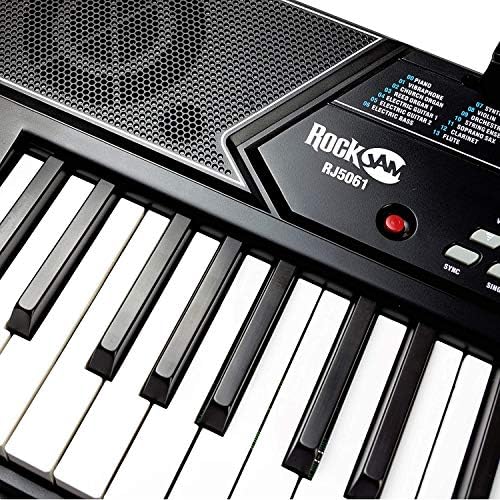 The RockJam 5061 keyboard piano super kit includes a digital keyboard with 61 full-size keys giving you that traditional piano feel whilst maintaining a portable and compact design that can be powered by either mains (power supply included) or batteries