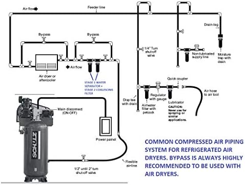 COMPRESSED AIR CONTAINS NATURALLY OCCURRING MOISTURE, WHICH CAN NEGATIVELY AFFECT COMPRESSED AIR APPLICATIONS THAT REQUIRE MOISTURE FREE AIR. DRYERS ARE A COMMON SOLUTION FOR REMOVING SUCH MOISTURE. ONE OF THE MOST POPULAR OPTIONS ARE REFRIGERATED AIR DRYERS, DUE TO ITS ABILITY TO REACH AN ACCEPTABLE DEW POINT IN. NON-CYCLING REFRIGERATED DRYERS, THE REFRIGERANT ACTUALLY CIRCULATES CONTINUOUSLY THROUGHOUT THE SYSTEM. BECAUSE BOTH THE FLOW OF COMPRESSED AIR AND AMBIENT TEMPERATURES VARY, A HOT GAS BYPASS VALVE IS USED TO REGULATE THE TEMPERATURE OF THE REFRIGERANT WHILE PREVENTING FREEZING WITHIN THE SYSTEM. IT IS VITAL THAT LIQUID WATER AND OIL ARE REMOVED FROM YOUR COMPRESSED AIR LINES BEFORE ENTERING ANY REFRIGERATED AIR DRYER. LIQUID WATER AND/OR OIL FROM YOUR COMPRESSOR CAN DAMAGE THE INTERIOR COMPONENTS OF THE DRYER RESULTING IN DRYER NON-PERFORMANCE OR FAILURE. WHEN YOU SELECT THE ” WITH PRE-FILTER OPTION” WE PROVIDE YOU WITH A STAGE 1 AIR PRESSURE REGULATOR WITH WATER SEPARATOR WITH AUTOMATIC FLOAT DRAIN IN ADDITION TO A STAGE 2 COALESCING FILTER / OIL REMOVING FILTER. PLEASE SEE OUR ATTACHED PICS. THE STAGE 1 WATER SEPARATOR HAS A 5 MICRON ELEMENT THAT WILL REMOVE 95% OF THE MOISTURE WATER FROM YOUR COMPRESSED AIR LINES. THE UNIT COMES WITH A 11oz METAL BOWL WITH SIGHT GLASS. THE STAGE 1 WATER SEPARATOR ALSO COMES EQUIPPED WITH INTERNAL FLOAT DRAIN THAT AUTOMATICALLY RELEASES MOISTURE WATER FROM THE BOWL. THE STAGE 2 COALESCING FILTER, ALSO KNOWN AS AN OIL REMOVING FILTER, REMOVES THE REST OF THE MOISTURE VAPOR THAT MADE ITS WAY THROUGH THE STAGE 1 WATER SEPARATOR, IN ADDITION TO ANY RESIDUAL OIL FROM YOUR COMPRESSED AIR LINES. THIS STAGE 2 UNIT ALSO COMES WITH 11oz METAL BOWL AND INTERNAL FLOAT DRAIN, HOWEVER ITS VERY UNLIKELY THAT ANY MOISTURE BUILD UP WILL OCCUR IN THIS STAGE 2 BOWL. ADS DRYER INFO: 1-PHASE 115V, 10 AWG WIRE REQUIRED, DEW POINT: 41 DEGREES FAHRENHEIT AT 100 PSI, REFRIGERANT FLUID TYPE: R134a, DRYER IS 75 LBS