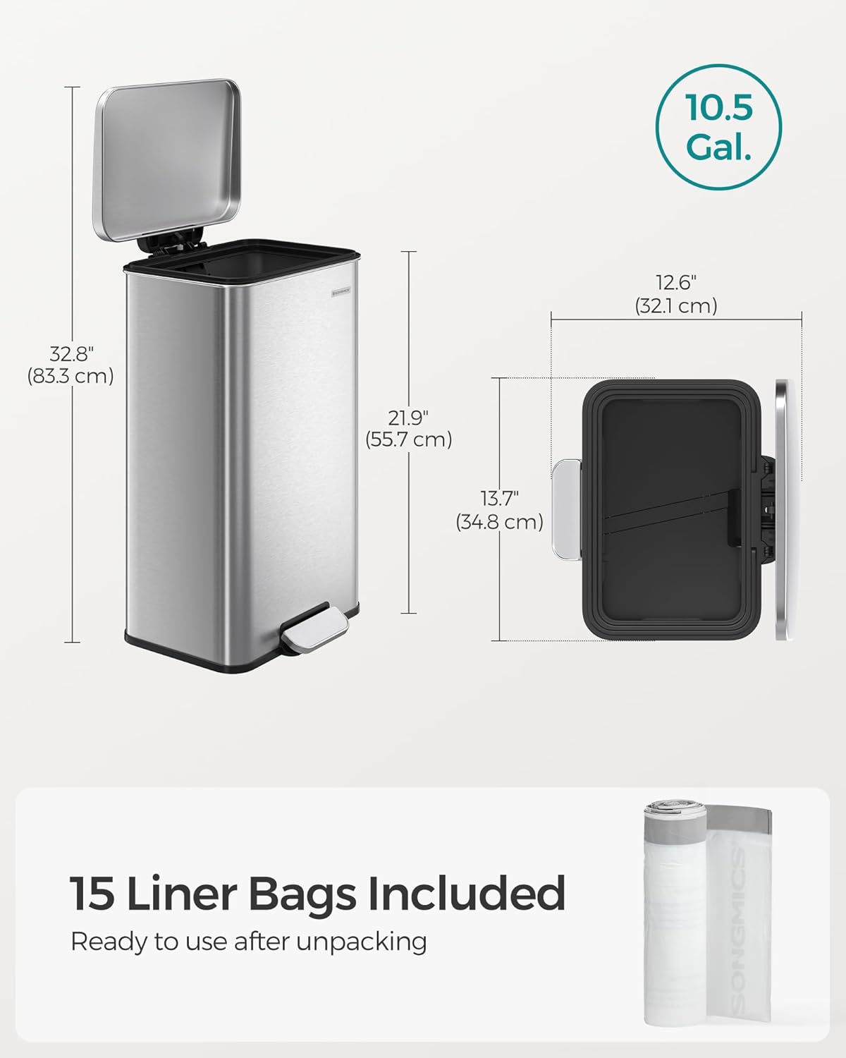 [15 Garbage Bags Included] To get you started, we’ve included 15 custom-fit SONGMICS trash bags (code 050A), designed to perfectly fit this step trash can