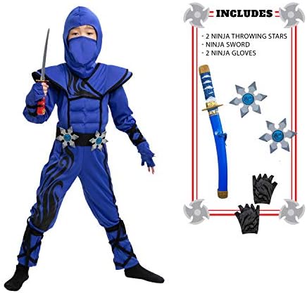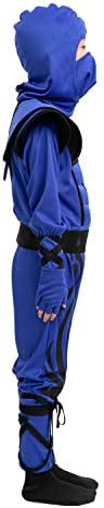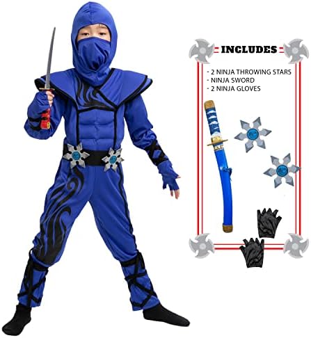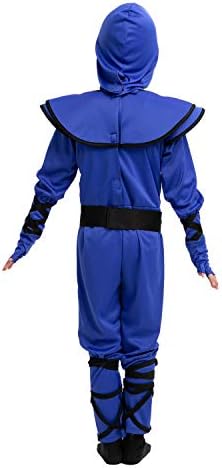 9 Pieces Total Halloween Blue Ninja Stealth Flame Costume for Boys and Girls Includes Ninja Blue Jumpsuit with Attached Hood, face mask, belt, ninja gloves, and other foam accessories.