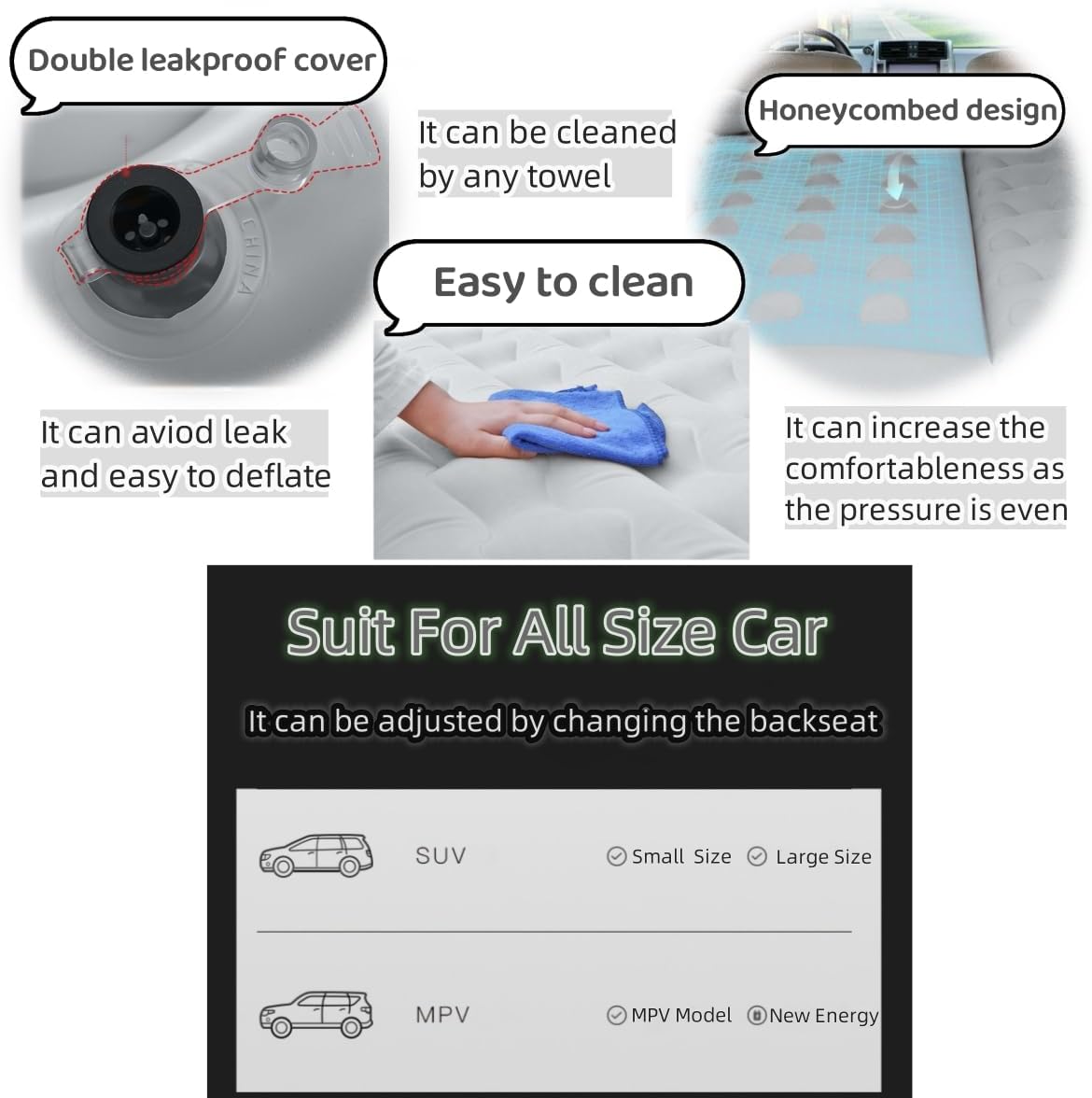 【Six Separate Air Chambers Design】 The car inflatable mattress has 6 separate air chambers that it can provide better stability and flexibility. When you plan to use the air bed, it can be inflated for one person size or muti-person size, so it suits for different car model, it can be used as truck bed air mattress as well as the rear seats camping air mattress.