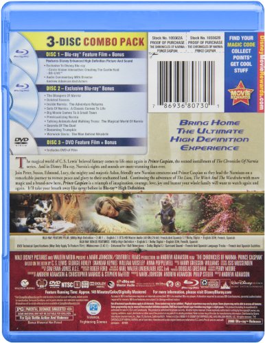 The magical world of C.S. Lewis’ beloved fantasy comes to life once again in PRINCE CASPIAN, the second installment of THE CHRONICLES OF NARNIA series. And in Disney Blu-ray, Narnia’s sights and sounds are more stunning than ever. Join Peter, Susan, Edmund, Lucy, the mighty and majestic Aslan, friendly new Narnian creatures and Prince Caspian as they lead the Narnians on a remarkable journey to restore peace and glory to their enchanted land. Continuing the adventure of THE LION, THE WITCH AND THE WARDROBE with more magic and a brand-new hero, PRINCE CASPIAN is a triumph of imagination, courage, love, joy and humor your whole family will want to watch again and again. It’ll take your breath away like never before in Blu-ray(TM) High Definition. The Chronicles of Narnia, Narnia, and all other book titles, characters and locales original thereto are trademarks of C.S. Lewis Pte Ltd. and are used with permission. (c) Disney/Walden