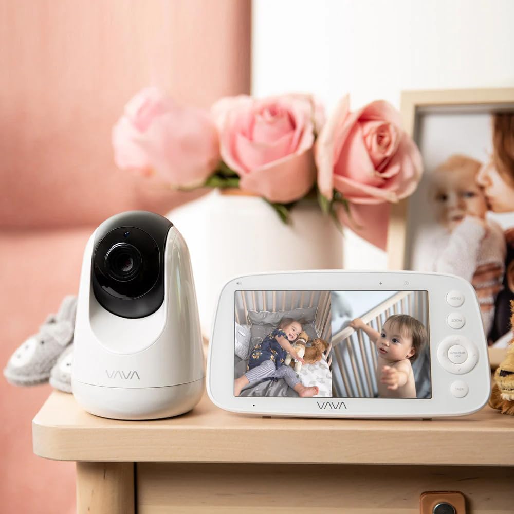 Product details Parenthood is an incredible journey filled with love and joy. The VAVA 8-inch 1080P Video Baby Monitor enhances this experience with its array of features. Enjoy the rechargeable, large 8” 1080P HD display for an ultra-clear view of your baby. With a 4500mAh capacity, it offers up to 18 hours in audio-only mode and up to 8 hours in audiovisual mode. The monitor boasts an impressive transmission range of up to 900 feet, allowing you to monitor from anywhere in your home. The built-in two-way audio communication feature lets you talk to your baby from a distance, offering comfort and reassurance. Smart IR night vision technology ensures visibility even in complete darkness, automatically switching to night mode. Pan 108° vertically and tilt 270° horizontally for flexible viewpoints. Real-time audio and video monitoring, along with instant zoom with Auto-Pilot Mode and 2X-4X Zoom, ensures you capture every precious moment. Choose from 5 soothing lullabies to create a calming atmosphere and connect up to 4 cameras for effortless management in 4-screen mode. Rechargeable 8” 1080P HD Display Long-range transmission up to 900 ft VOX Two-way Talk Infrared Night Vision Pan & Tilt Camera Control Real-time Audio and Video Monitoring Auto-Pilot Mode & 2X 4X Zoom Lullabies Multiple Room Coverage: Connect Up to 4 Cameras Split Screen up to 4 Screens