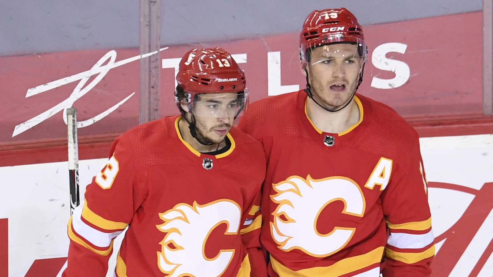 Calgary Flames forward Matthew Tkachuk (19) with forward Johnny Gaudreau (13)