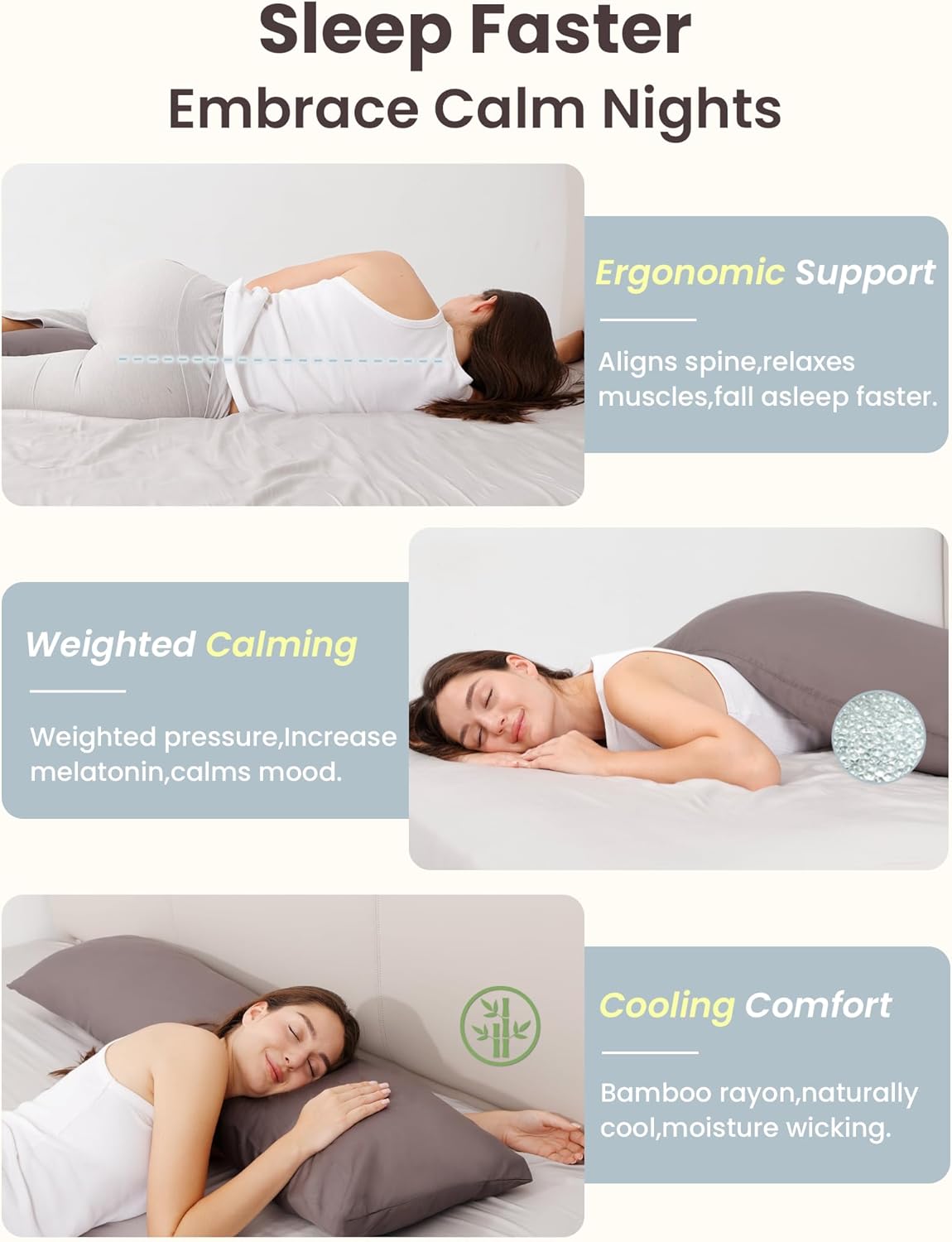 High-Quality Materials:This weighted body pillow cover is made of soft, moisture-absorbent and quick-drying bamboo fiber material, filled with non-toxic and hypoallergenic glass beads, providing breathable comfort throughout the four seasons.